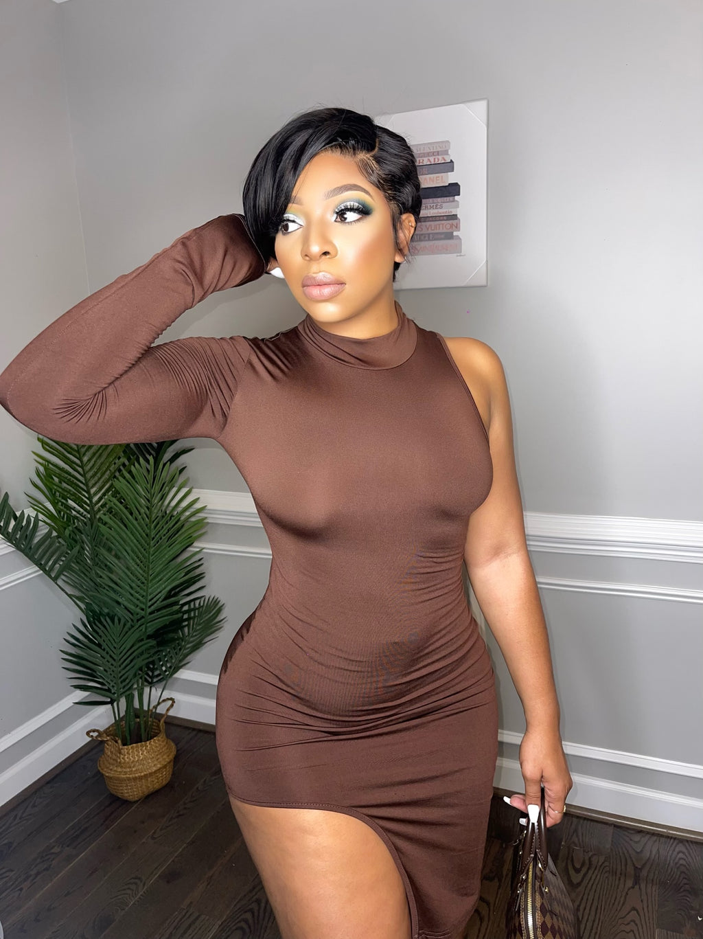 Gorgeous, super slimming, curve hugging high neck dress. Be ready to turn heads when you walk in the room!